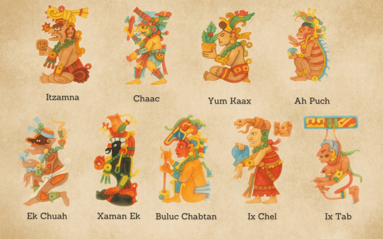 | Itzamna | Fils de Hunab, dieu du ciel, de la nuit et du jour. Il transmet aux hommes l’écriture et le calendrier. Représenté comme un vieillard aux joues creuses et au nez proéminent. |