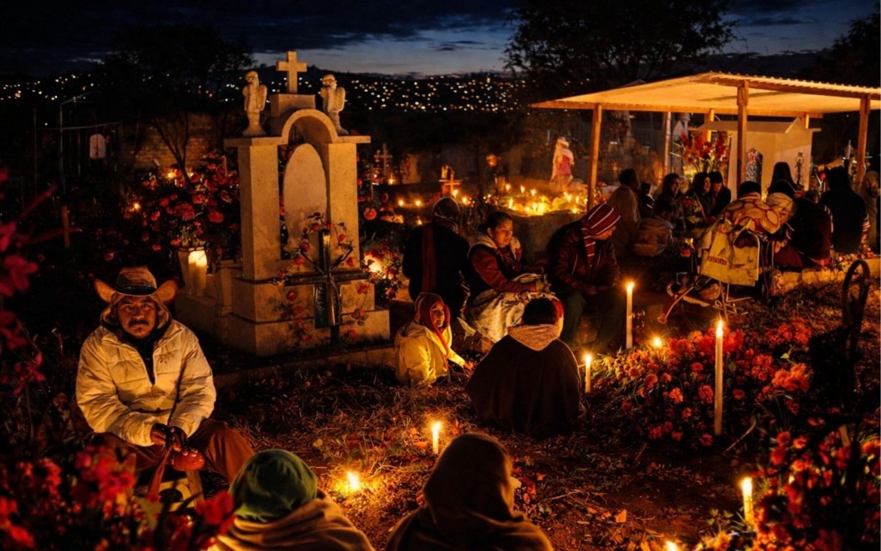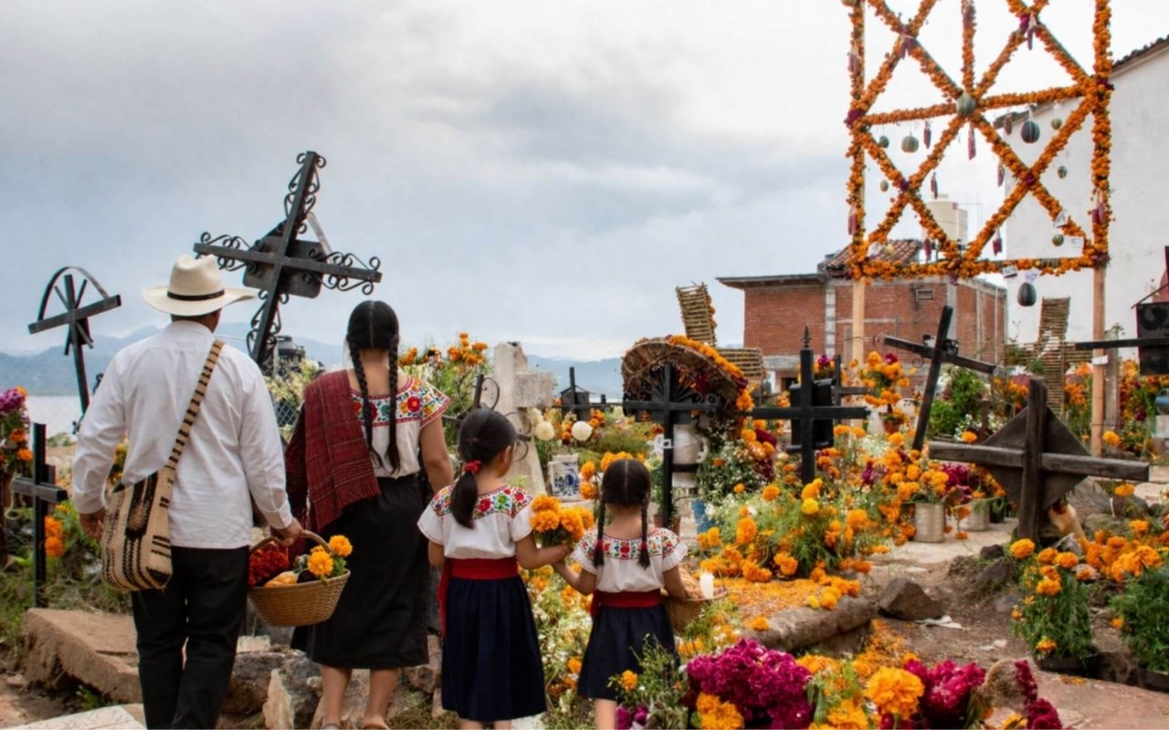 Dans la région purépecha, notamment à Janitzio, Tzintzuntzan ou sur l’île de Yunuén, la nuit du 1er au 2 novembre constitue le moment central. Les familles se rendent au cimetière avec des bougies, des fleurs et des aliments, et restent auprès des tombes jusqu’à l’aube.