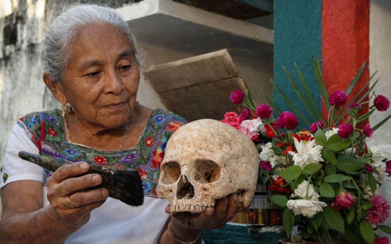 Pomuch (Campeche) : À Pomuch, la relation aux défunts prend une forme plus directe. Les familles pratiquent le nettoyage des ossements (appelé limpia de huesos), généralement quelques jours avant le Día de los Muertos. Les restes sont sortis des ossuaires, nettoyés à la main puis replacés dans des boîtes recouvertes de tissus brodés.
